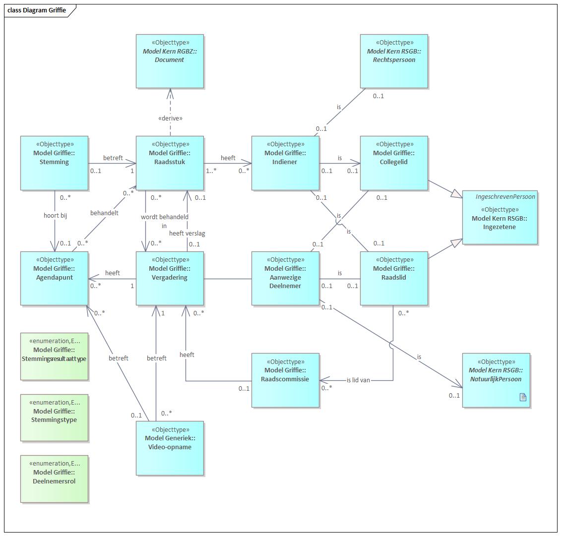 De definities van de objecttypen zijn afgeleid van de in het RIS opgeslagen informatie. Bovendien is er gebruik gemaakt van het informatiemodel uit de Pilots Open Raadsinformatie die op het moment van schrijven nog in ontwikkeling is. Er is gekozen de gegevens zoals die nu in het RIS van Delft worden geadministreerd als uitgangspunt te nemen, welke op een aantal punten afwijken van het informatiemodel uit de Pilots Open Raadsinformatie. In onderstaand figuur is het informatiemodel uitgewerkt. Centraal staan ‘Raadsstuk’ en ‘Vergadering’. De raadsstukken zijn alle stukken die door de gemeenteraad behandeld worden, zoals: amendement, motie, voorstel, antwoord, ingekomen stuk en mededeling. Het ‘Raadsstuk’ is afgeleid van het generieke RGBZ-type ‘DOCUMENT’, en kent de attributen van dit type. In een ‘Vergadering’ worden meerdere agendapunten besproken, waarbinnen steeds een aantal raadsstukken behandeld kunnen worden. Ook kan er bij een bepaald ‘Agendapunt’ een ‘Stemming’ plaatsvinden, die weer een bepaald ‘Raadsstuk betreft’. Stemming is overgenomen uit Pilots Open Raadsinformatie, maar wordt op het moment van schrijven niet vanuit het RIS ondersteund. Er kunnen video-opnames zijn van hele vergaderingen, of van individuele agendapunten van vergaderingen. Raadsstukken kunnen 0 of meer indieners hebben. Raadstukken met 0 indieners zijn procedurele stukken zoals de agenda en de lijst ingekomen stukken. Een ‘Indiener’ kan een ‘Raadslid’, een ‘Collegelid’ of een generiek ‘RECHTSPERSOON’ zijn. De laatste variant wordt gebruikt als een burger, een bedrijf of een instelling een stuk instuurt. Zowel ‘Raadslid’ als ‘Collegelid’ zijn afgeleid van ‘INGEZETENE’ uit de RSGB.