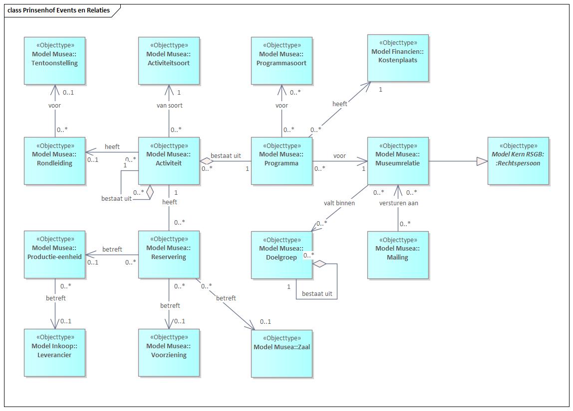 Hierbij staan activiteiten binnen programma’s voor museumrelaties centraal. Een ‘Programma’ bestaat uit 0 of meer activiteiten. Iedere ‘Activiteit’ kan weer uit 0 of sub-activiteiten bestaan. Een ‘Activiteit’ is van een ‘Activiteitsoort’. Hetzelfde geldt voor een programma, deze is van een ‘Programmasoort’. Aan een ‘Activiteit’ kunnen reserveringen zijn gekoppeld. Het kan hier gaan om reserveringen voor: zalen, voorzieningen en productie-eenheden. Dit is uitgebeeld met een koppeling vanuit ‘Reservering’ naar 0 of meer objecttypes ‘Zaal’, naar 0 of meer objecttypes ‘Productie-eenheid’ en 0 of meer objecttypes ‘Voorziening’. Een ‘Productie-eenheid’ kan een externe leverancier zijn, in dit geval is er een koppeling met ‘Leverancier’. Aan een ‘Activiteit’ kan een ‘Rondleiding’ zijn gekoppeld, die weer aan en ‘Tentoonstelling’ kan zijn gekoppeld. Een ‘Programma’ kent een kostenplaats waarmee het is gekoppeld aan een ‘Kostenplaats’ en de koppeling met de financiële administratie is geborgd. Binnen het datamodel van het Prinsenhof worden relaties (personen, bedrijven en instellingen) vormgegeven in het objecttype ‘Museumrelatie’. Een ‘Museumrelatie’ is afgeleid van een ‘Rechtspersoon’, waarmee alle benodigde kenmerken, zoals naam, adres en kvk-nummer zijn geborgd. Aan museumrelaties worden mailings gestuurd, hierom is het objecttype ‘Mailing’ aan ‘Museumrelatie’ gekoppeld. Voorgaande is uitgewerkt in de volgende figuur.
