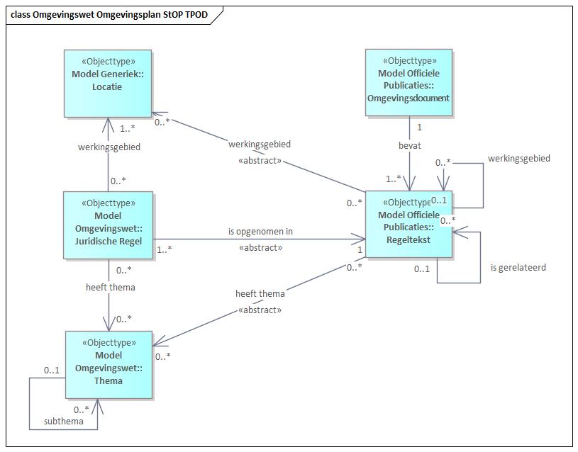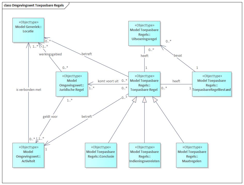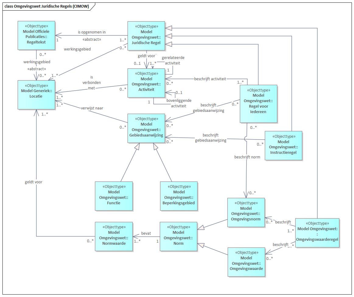 Dit diagram geeft een overzicht van alle onderkende objecttypen, zoals een activiteit, een regel, een functie, enzovoorts. Hierover wordt informatie bijgehouden, en worden verschillende soorten onderkend. Zo is een functie ‘horeca in het centrumgebied’ niet gelijk aan de functie ‘natuurgebied met water’, maar beide zijn wel een functie en worden informatiekundig als gelijksoortig gezien, te weten als een functie met een vrij te kiezen naam. Een ‘Regeltekst’ is de kleinste zelfstandige eenheid van (een of meer) bij elkaar horende Juridische regels in een tekst met Artikelstructuur, te weten een artikel of een lid. Een ‘Juridische Regel’ is opgenomen in een ‘Regeltekst’ (abstract vanwege annotatie). Een ‘Juridische Regel’ is regel met juridische werkingskracht. Een regel betreft binnen de Omgevingswet veelal activiteiten, en/of normen en/of gebiedsaanwijzingen. Er worden drie soorten juridische regels onderscheiden: