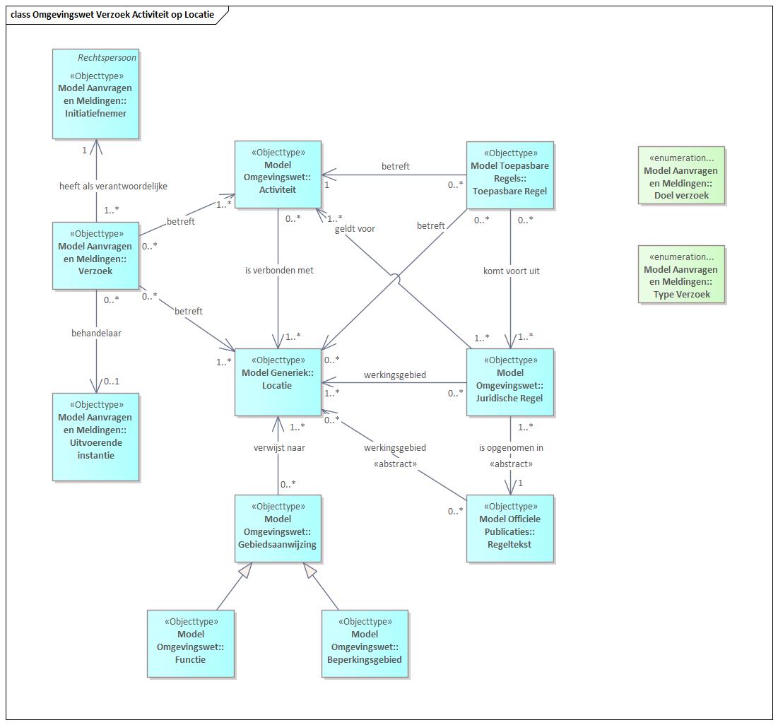 Centraal staan ‘Activiteit’ en ‘Locatie’. Verzoeken voor een omgevingsvergunning worden ingediend om een bepaalde activiteit op een bepaalde locatie uit te voeren. Daarnaast gelden er juridische regels voor activiteiten op bepaalde locaties. Deze juridische regels worden gegenereerd op basis van annotatie van regelteksten die onderdeel uitmaken van omgevingsdocumenten. Aan deze juridische regels zijn gebiedsaanwijzingen gekoppeld, waarmee een bepaalde functie kan worden bepaald of een beperkingsgebied wordt opgelegd.