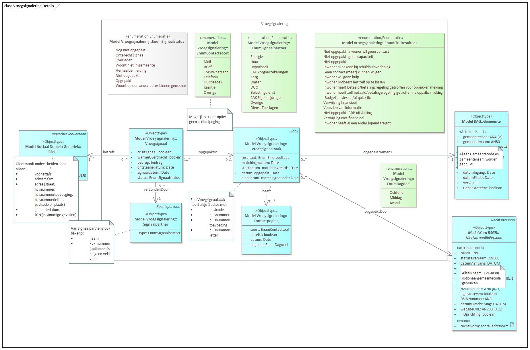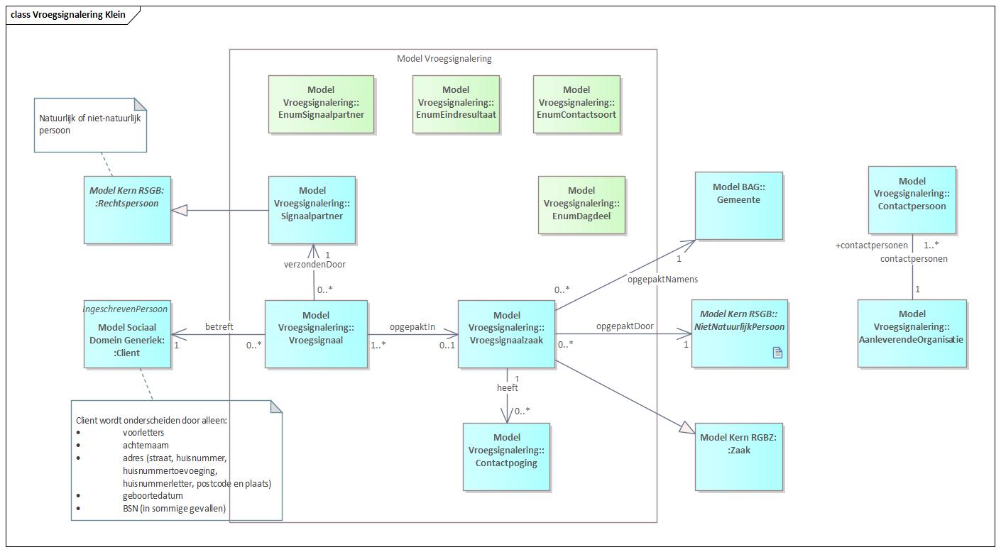 De kern van het informatiemodel Vroegsignalering bestaat uit Vroegsignaal en uit Vroegsignaalzaak. Vroegsignalen worden door de Signaalpartners aangeboden. Vroegsignalen betreffen een bepaalde Client, waarvan tenminste de adresgegevensbeschikbaar zijn. Vervolgens worden ovr een bepaald interval alle vroegsignalen namens een gemeente opgepakt in een Vroegsignaalzaak. Binnen een Vroegsignaalzaak wordt er in een aantal contactpogingen contact gezocht met de Client.