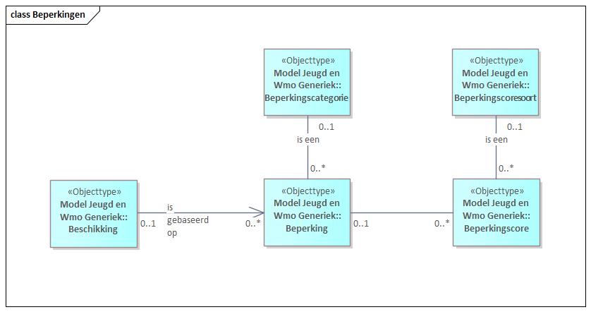 Een ‘Client’ kan meerdere ‘Beschikkingen’ hebben op basis van 1 of meer beperkingen die gescoord zijn met een ‘Beperkingscore’. Zowel ‘Beperking’ als de score komen voor een en referentietabel. In de ‘Wmo-beschikkingen’ worden 1 of meer voorzieningen toegekend, die voorkomen in de lijst voorzieningen die de gemeente Delft ondersteunt.