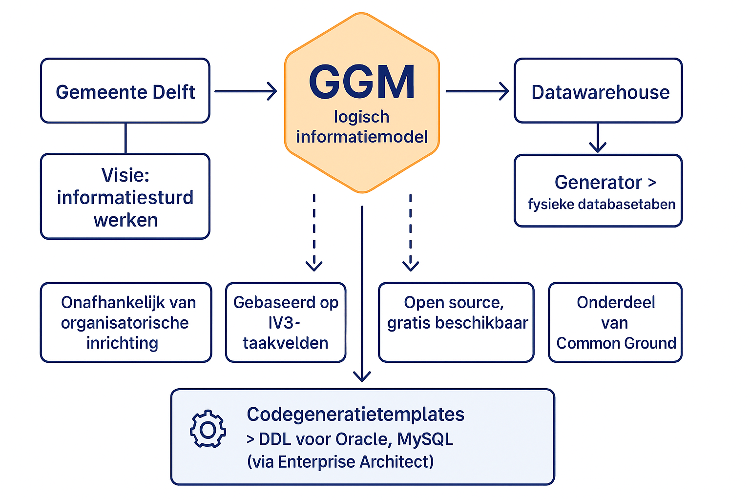 Belangrijk: het GGM is primair logisch. Technische implementaties (tabellen, JSON Schema, API’s, RDF) worden afgeleid op basis van het beoogde gebruik.
