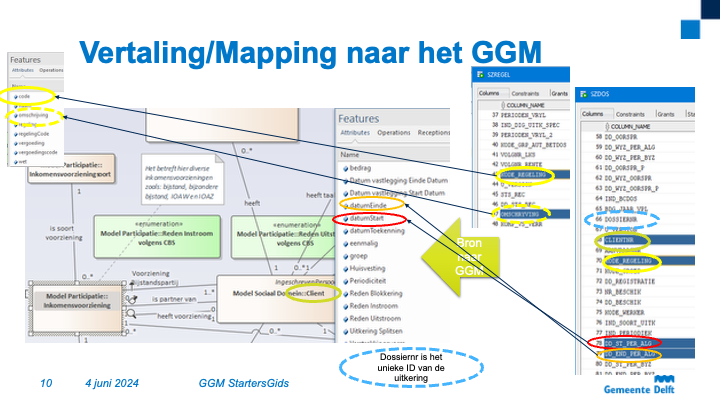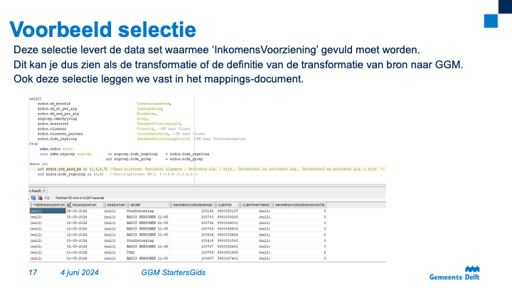Deze selectie levert de data set waarmee ‘InkomensVoorziening’ gevuld moet worden.Dit kan je dus zien als de transformatie of de definitie van de transformatie van bron naar GGM.